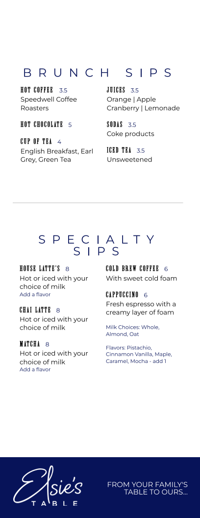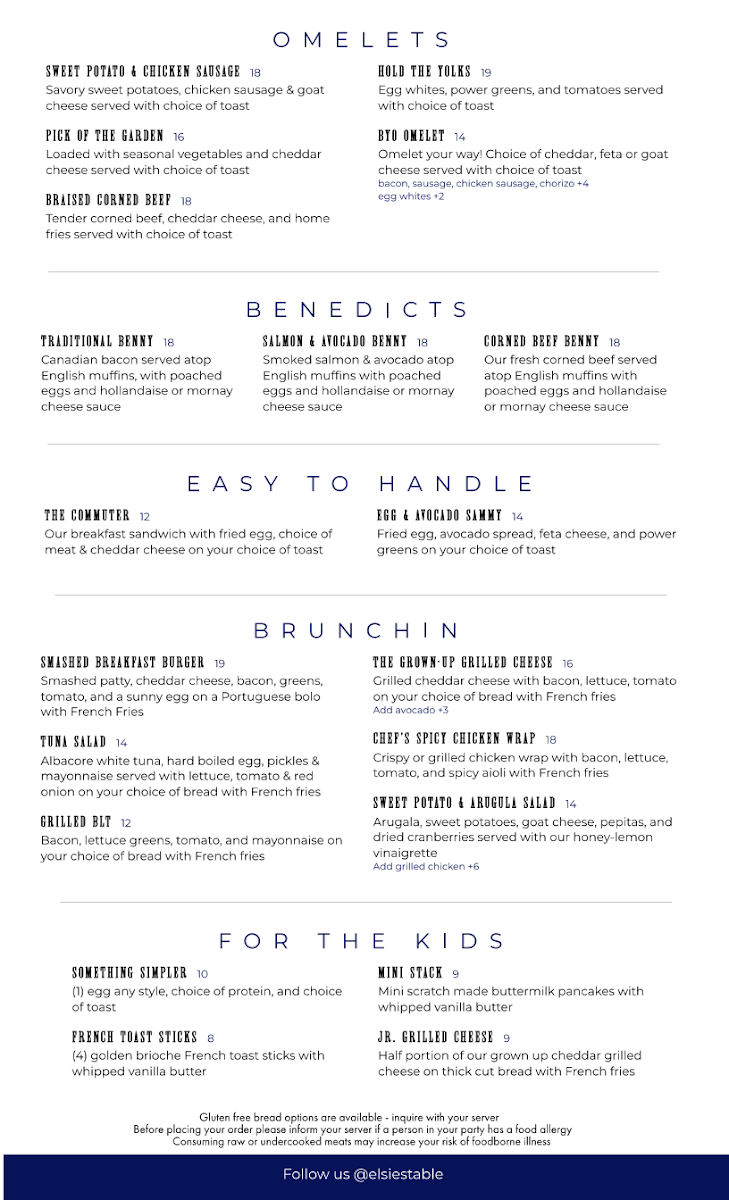 Whether stopping by for a leisurely brunch, sharing a meal with family, or enjoying an evening out, the menu reflects a warm, unpretentious dining experience that pairs well with the intimate and cozy setting of Elsie’s Table.